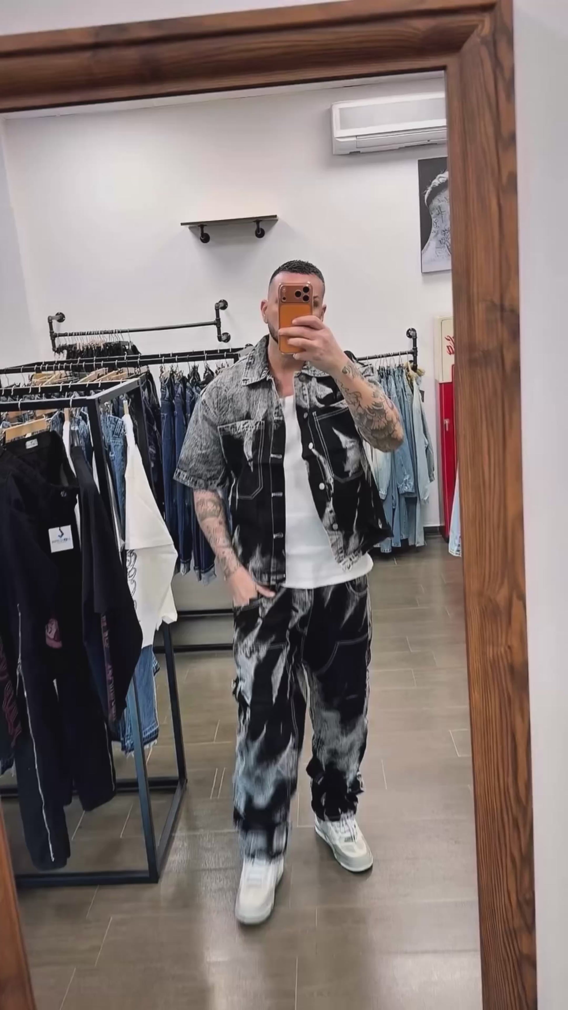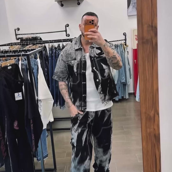Set coordinato in denim effetto washed black dal forte impatto street.
